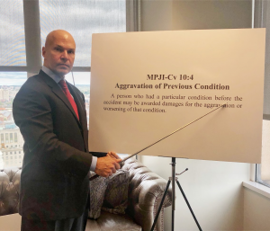 We have a jury instruction on this in Maryland that I’m pointing to in this picture (you can click on the picture to see the instruction). What it says, and most states have a similar law, is that an injury victim should be awarded damages from making a prior injury worse.